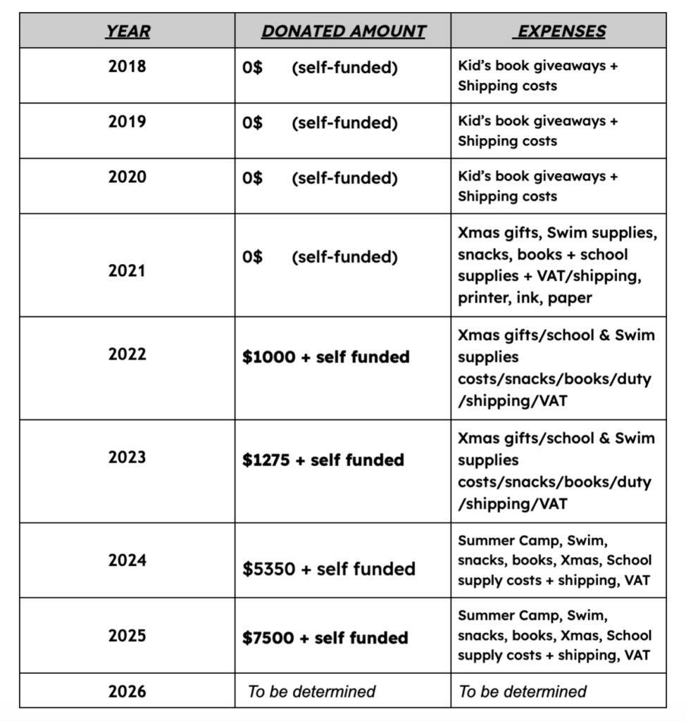 For the Summer Reading Program, we sometimes have 1-2 trusted volunteers help us. Also, I am ALWAYS training and enlisting the help of the kids, so that they learn how the mission works, how we get shipments, donor relations and donations, how to process customs paperwork, how to work with our valuable community partners, and especially how to give swim lessons and provide reading tutoring! I pray that one day, one of the children will step up and take over the mission from me, they’re inspiration for all this work and it will be theirs to build up and help even more children someday soon!